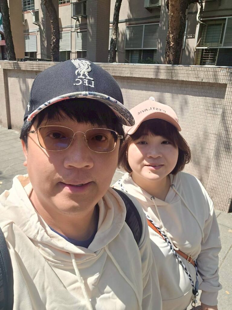 我和老婆都戴起帽子不然會熱死